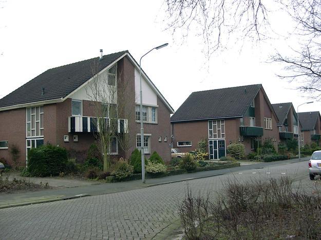 Aan de rand bevinden zich grote twee-onder-een-kap woningen van dezelfde architectuur, maar vaak met een eigen kleurstelling.