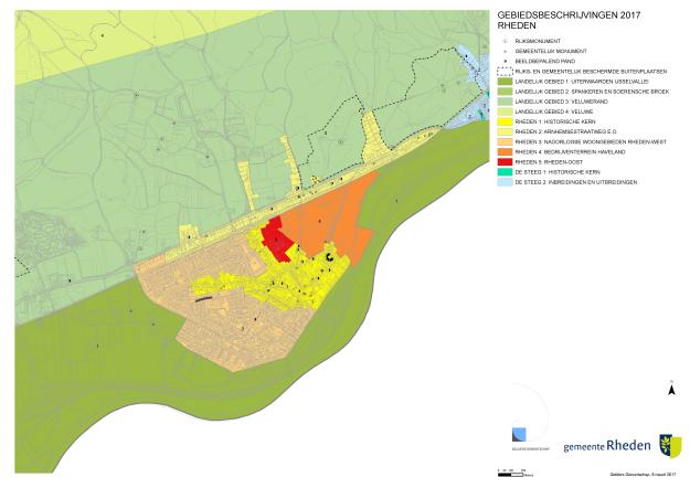 De van oorsprong agrarische kern van Rheden heeft zich ontwikkeld rond de verknoping van de Groenestraat, de Veerweg en de Dorpsstraat, met de N.H.-Kerk en de omliggende historische bebouwing als centrum. De kern breidde zich in de negentiende eeuw vooral uit in westelijke richting rond de verschillende veldwegen en schaapsdriften. Langs de Groenestraat en de Arnhemseweg ontstonden dorpse bebouwingslinten. Langs de overige straten lag het accent op individuele woonhuizen. Uitbreiding van het winkelbestand vond vooral plaats in de twintigste eeuw langs de Dorpsstraat. Vaak ging het om verbouwing en uitbreiding van historische bebouwing. Na de Tweede Wereldoorlog ging men in veel gevallen over op vervangende nieuwbouw van afwijkende schaal en vormgeving. Door de specifieke ligging en groei van Rheden lijkt het historische, parkachtige dorpscentrum enigszins afzijdig te liggen van het huidige dorpscentrum.