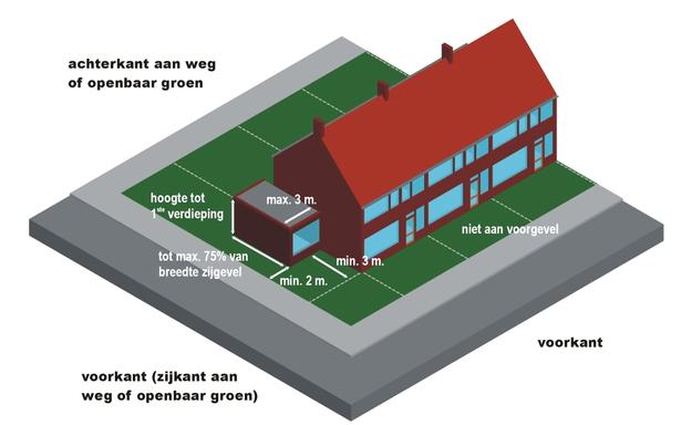- afstand van de aan- of uitbouw aan de zijgevel tot voorgevellijn minimaal 3.00 m.