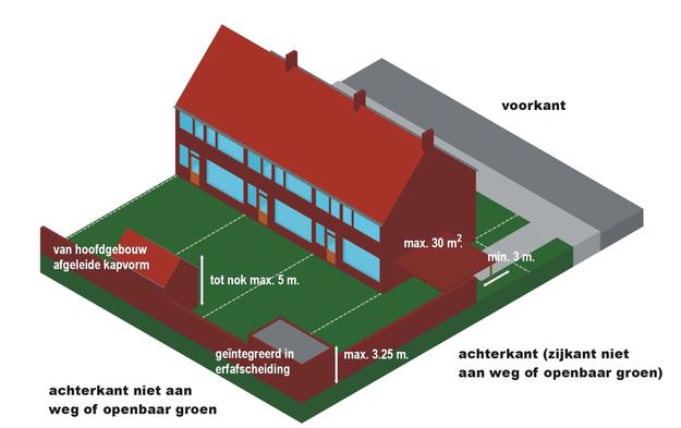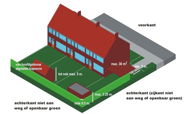 - oppervlakte maximaal 30 m2 tot in totaal maximaal 50% van het oorspronkelijke achter- of zijerf is bebouwd.