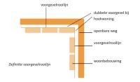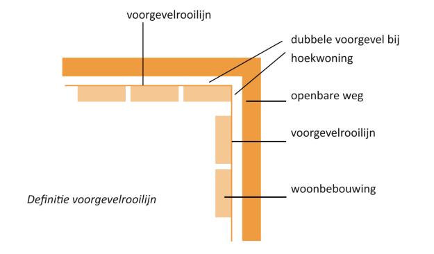 De voorgevelrooilijn ligt ter plaatse of in het verlengde van de naar de weg gekeerde gevel van een gebouw of, als het een gebouw betreft met twee naar de weg gekeerde gevels, beide gevels (zie schema).