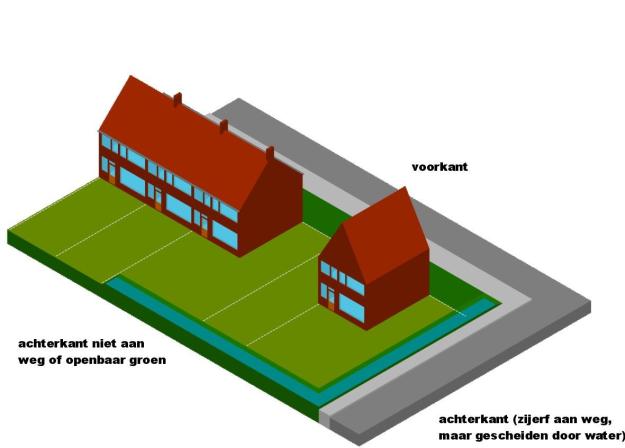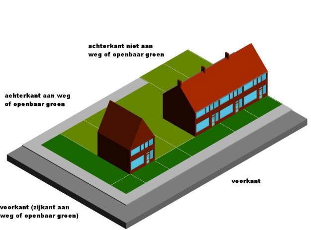 Het begrip 'weg' wordt nader verklaard in de Wegenverkeerswet. Bij het begrip 'openbaar groen' moet worden uitgegaan van hetgeen daaronder in het normale spraakgebruik wordt verstaan, zoals parken plantsoenen en speelveldjes, die het gehele jaar (of een groot deel van het jaar) voor het publiek toegankelijk zijn. 'Gekeerd naar de weg of het openbaar groen' impliceert dat tussen het gebouw of het erf en de weg of het openbaar groen een directe feitelijke relatie is. Die relatie is er niet wanneer zich tussen het gebouw of het erf en de weg of het openbaar groen andere begrenzende elementen aanwezig zijn, zoals het erf van de buren, bos, (bij)gebouwen of water. Dit betekent dat bijvoorbeeld bij een sloot als scheidend element de zijkant gekeerd naar de weg of het openbaar groen een achterkant wordt in plaats van een voorkant.