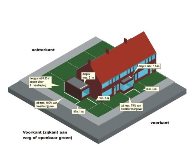 - Breedte aan de voorgevel tot maximaal 75% de oorspronkelijke breedte van de voorgevel, met een maximum van 3.50 m.