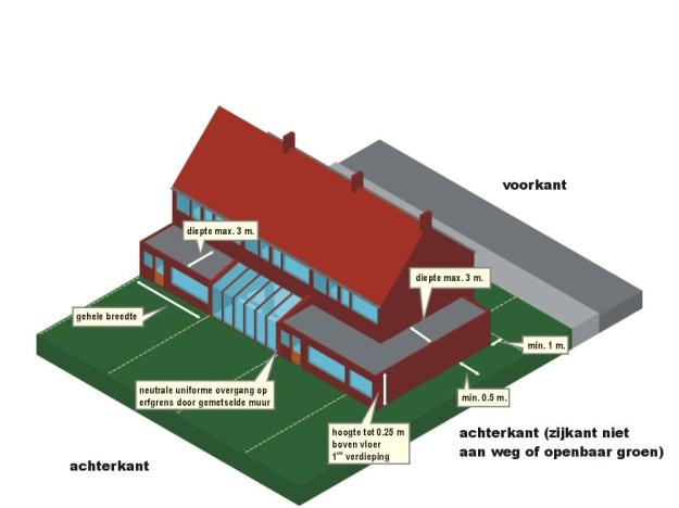 - De achtergevel van de aan- of uitbouw aan de zijgevel dient bijvoorkeur niet gelijk te lopen met de achtergevellijn van hoofdgebouw, maar juist te verspringen.