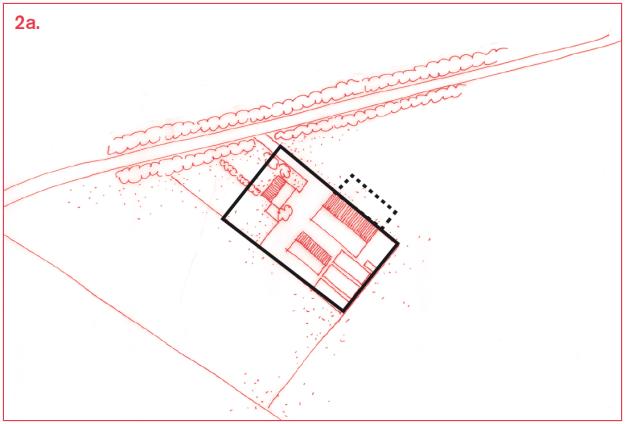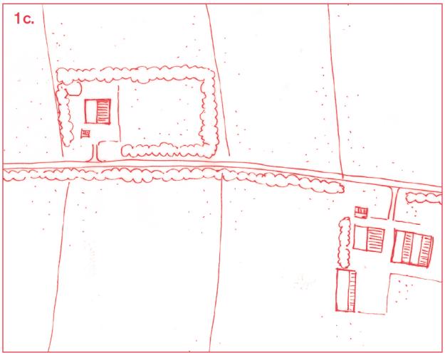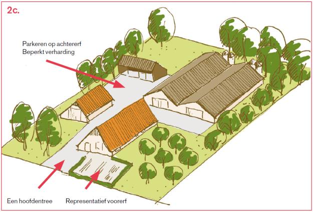 c. Er is één hoofdtoegang tot het erf, ook bij meerdere woningen op een erf. Dit is de kortste route vanaf de openbare weg naar de centrale ruimte op het erf. Beperk de verharding en kies voor materialen die aansluiten bij het landelijke karakter. Parkeren vindt plaats op het achtererf, uit het zicht.Voeg hier de tekst van de alinea in