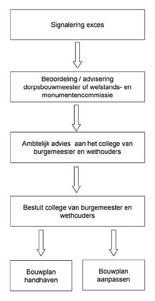 Volgens artikel 13a Woningwet 2011 kan het college van burgemeester en wethouders de eigenaar van een bouwwerk dat ‘in ernstige mate in strijd is met redelijke eisen van welstand’ aanschrijven om die strijdigheid op te heffen. Het college van burgemeester en wethouders kunnen zich hierbij beroepen op de criteria die in deze welstandsnota zijn opgenomen. De dorpsbouwmeester of welstands- en monumentencommissie hebben hierin een adviserende rol. In het onderstaande schema wordt de te volgen procedure schematisch weergegeven.