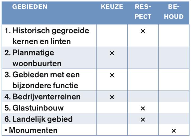 De richtlijnen voor grotere bouwopgaven zijn, zoals gezegd, afhankelijk van het beleidsniveau dat aan een deelgebied is toegekend. Dit beleidsniveau geeft uitdrukking aan de houding die van belang gewenst wordt bij de planontwikkeling en beoordeling. De niveaus onderscheiden zich in de mate van vrijheid in de omgang met de bestaande stedenbouwkundige of landelijke structuur en architectuur. We onderscheiden de volgende beleidsniveaus: