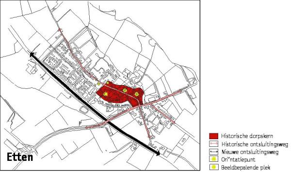 Etten heeft een karakteristieke historische kern met twee kerken, een molen, verschillende monumentale gebouwen en leuke smalle straatjes, het totaalbeeld is heel bijzonder en sfeervol. Er zijn nauwelijks nieuwe elementen in het historische gedeelte opgenomen. Het aanzicht van het dorp vanuit het omringende landschap met zijn twee torens, hoge bomen en oude boerderijen, is ook zeer karakteristiek. Binnen de kern is de veel te grote parkeerplaats bij de R.K. kerk een negatief aspect er ontstaat zo een te grote lege ruimte die zich niet verhoudt met de kleinschaligheid en gedifferentieerdheid van de kern van Etten. Ook negatief is het beeld van het dorp vanaf de oude verbindingsweg van Terborg via Etten naar het westen. Negatief is het beeld vanwege de rommelige opbouw, met grootschalige bebouwing en bestrating, in plaats van het kleinschalig beeld dat bij een oud dorp wordt verwacht.