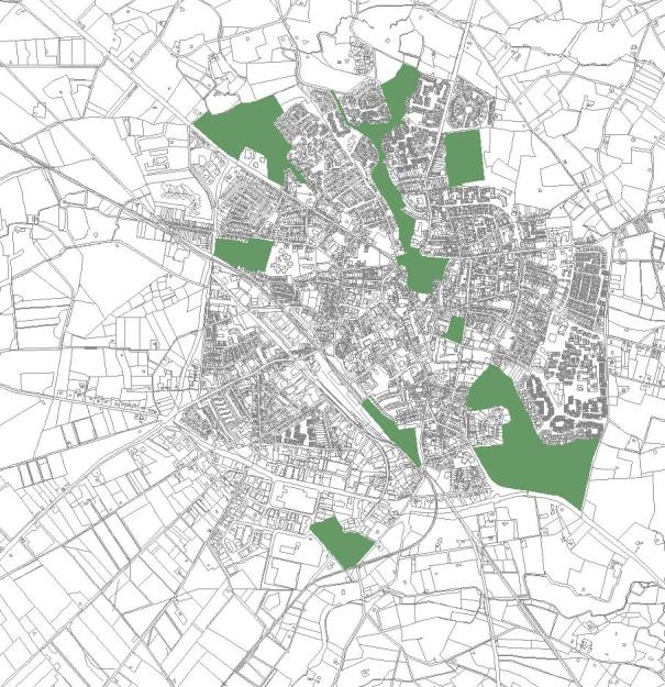 Binnen deze bouwsteen vallen diverse sportcomplexen, een begraafplaats en de groenzone rondom de Whemerbeek. De sportcomplexen komen voornamelijk voor aan de rand van de kern. Op deze complexen is meestal bebouwing aanwezig in de vorm van kantines met kleedlokalen, sporthallen en tribunes.