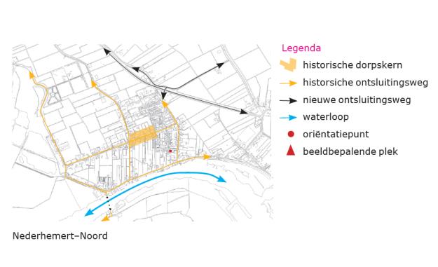 Nederhemert-Noord is te typeren als een es- en een dijkdorp. De bebouwing bevindt zich voornamelijk langs de Molenstraat. Deze straat is dan ook de hoofdas van het dorp. Hier zijn de oude boerderijen nog een verwijzing naar het agrarische karakter van het dorp. Het straatbeeld is nu heel divers, de ruimtes tussen de boerderijen zijn opgevuld met woningen en bedrijfjes van verschillende aard. De molen en haven bij de rivier is een beeldbepalende plek die samen met de bebouwing langs de dijk en de doorzichten over de weides heen naar de rest van het dorp het karakter van dijkdorp eer aandoet.