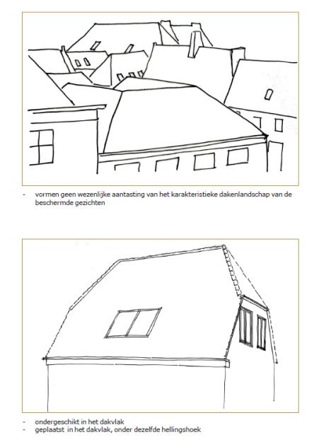 - op een schuin dak geldt dat het zonnepaneel of de -collector wordt geplaatst geheel binnen het dakvlak, onder dezelfde hellingshoek als die van het dakvlak