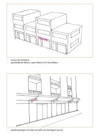 - plaatsing tegen de gevel of tegen of onder de luifel van de begane grond, nabij de winkelentree en/of pui