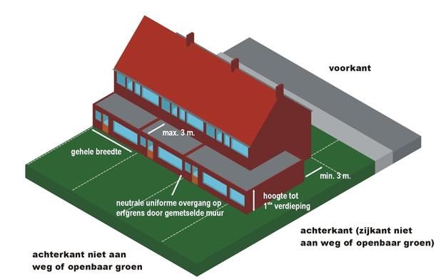 - aan- of uitbouw aan de achtergevel mag de zijgevellijn niet overschrijden, tenzij er sprake is van een hoekaanbouw (geen hoekaanbouw als zijerf grenst aan weg of openbaar groen);