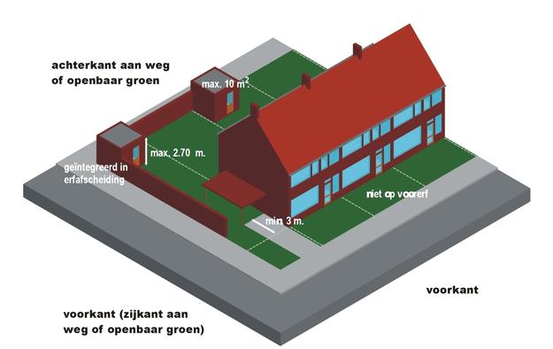 - afstand tot erfgrens minimaal 0.50 m. (achter erfafscheiding) tenzij bijgebouw wat betreft materialisering is geïntegreerd in erfafscheiding (bijvoorbeeld beiden metselwerk);