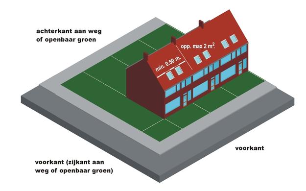- maximaal twee dakramen op voordakvlak en vier dakramen op achter- en zijdakvlak, tot in totaal maximaal 50% van het oppervlak van het betreffende dakvlak is bebouwd.